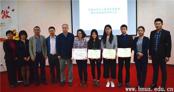 文学院党总支副书记刘佳宣读表彰决定,对荣获共青团中央系统三奖项的卓越班先进个人和集体以及荣获全国奖项的大学生志愿助残团进行表彰。其中,国家级大学生创业创新项目“北师人BNUZER”在共青团中央、中国青年报社、中国高校传媒联盟联合举办的“2016寻找全国高校最受欢迎的百强校园媒体”评比中荣获“优秀校园媒体奖”;2014级卓越班学生陈瑞意在共青团中央、中国电信集团公司共同举办的2016年“飞Young创业英雄汇”双创精英选练营中荣获“大学生双创先锋”荣誉称号;2014级卓越班团支部在共青团中央举办的全国高校“活力团支部”评选活动中荣获“活力团支部”荣誉称号,大学生志愿助残团荣获中国扶贫基金会“中国石油•公益未来”成才基金项目的资助。