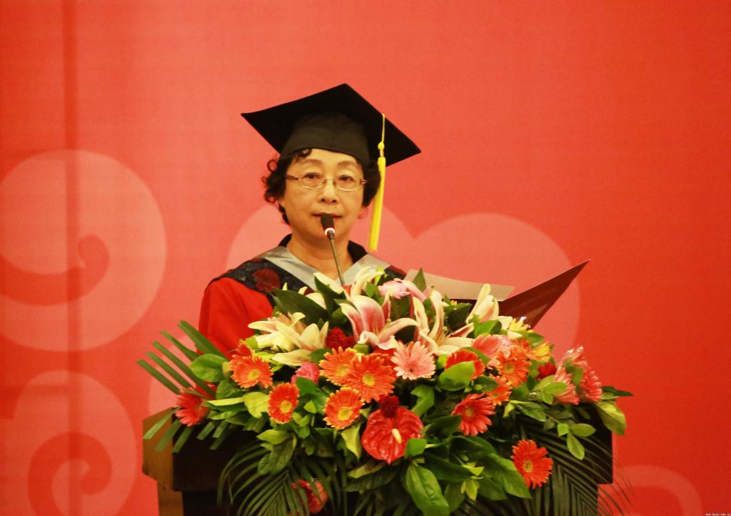 管理学院何建华教授作为教师代表为毕业生送上祝福和临别寄语。她希望毕业生们在毕业之后能够做到“三个坚持”:无论将来从事什么工作,都要始终坚持梦想;要时时刻刻注意坚持学习;要一如既往地坚持创新。