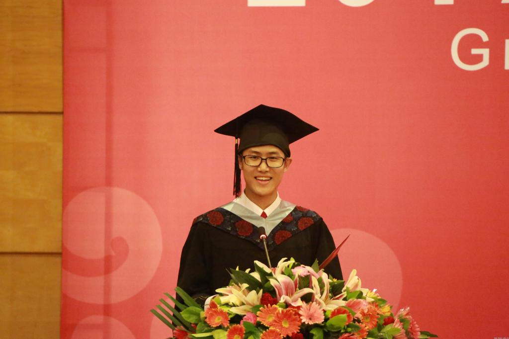 校友代表钱婧目前是一名大学教师,也是一位科研工作者,主持两项国家自然科学基金项目,她在典礼上以自身经验为学弟学妹们送上祝福,告诉即将毕业的学弟学妹们今后要敬业、精益、专注、创新,用心呵护自己的目标和梦想。