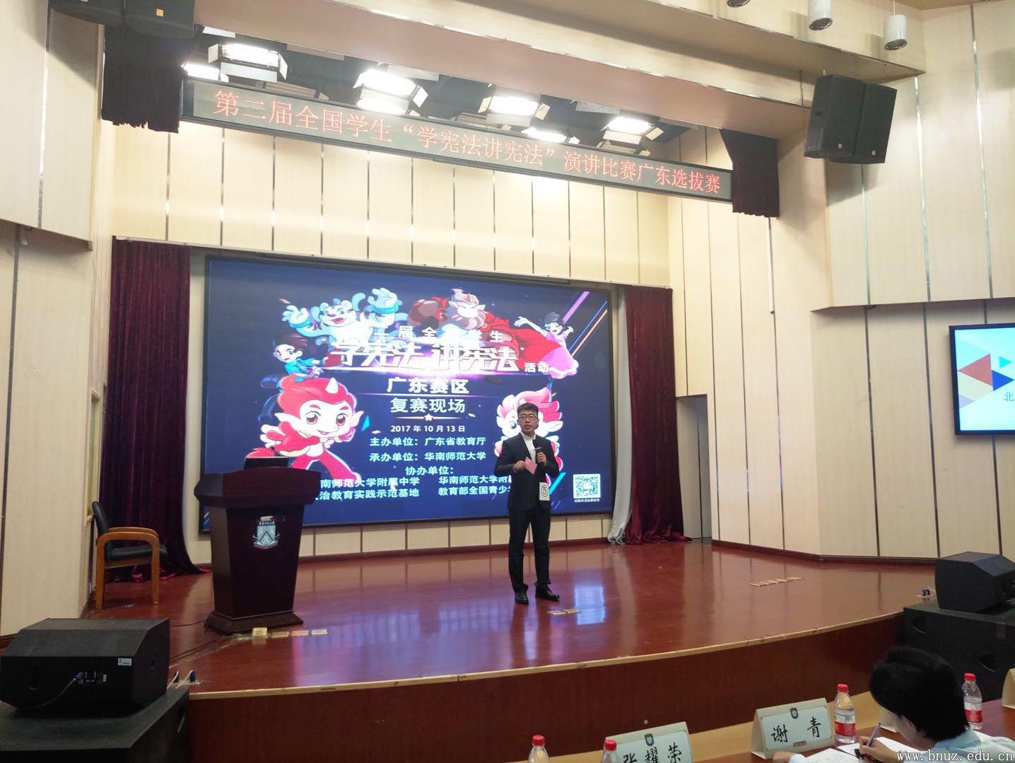 9月24日,法政学院与校团委联合举办初赛,并将初赛视频报给广东省教育厅政策法规处。经过15名专家评审初赛视频,从109名选手中选出了32名参加复赛的同学(小学组、初中组、高中组、高校组各8名)。在今天的复赛中,李昌昊同学以《学习宪法,推开权利之门》为题,围绕着国家、公民、权利,多角度阐述了对宪法的认识和思考,流畅的语言表达、得体的肢体动作、饱满的精神面貌赢得现场阵阵掌声。