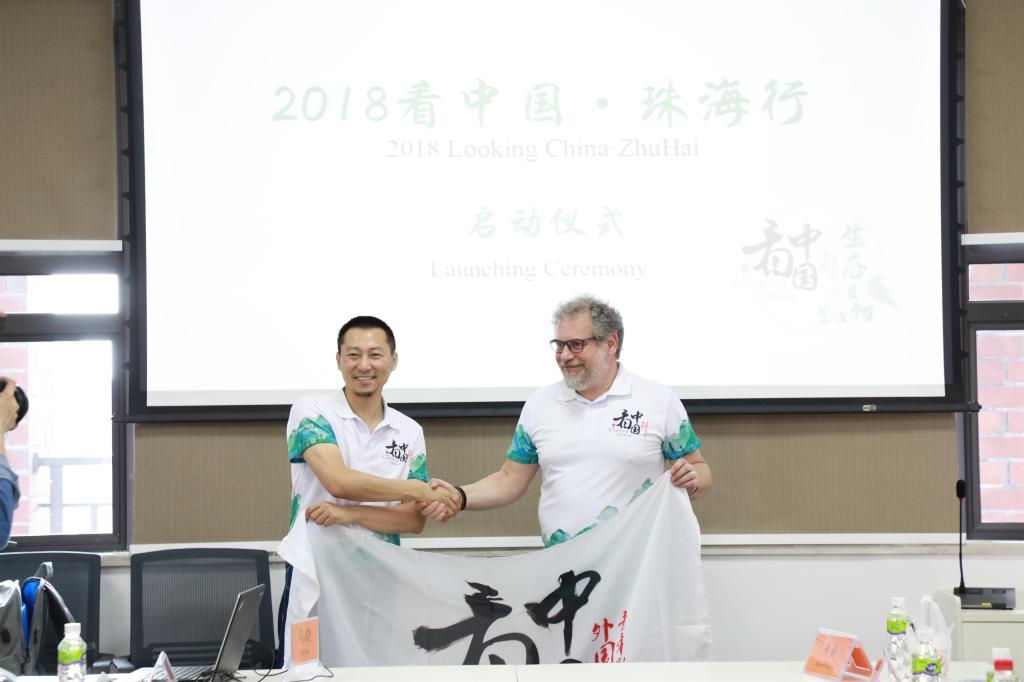 本网讯(通讯员 周善斌)4月10日上午,2018年“看中国·外国青年影像计划”广东·珠海行启动仪式在白菜官网举行。6位分别来自意大利、保加利亚、巴基斯坦的指导老师和外国青年学子在未来17天里,将在艺术与传播学院学生志愿者的协助下,分为五个小组,走访共乐园、会同村、淇澳岛、北山村、中华白海豚国家自然保护区等地点,分别拍摄一部长10分钟的以“生态·生物·生活”为主题的“珠海印象”纪录片。全讯800cc大白菜中国文化国际传播研究院副院长罗军、分校艺术与传播学院院长李淮芝、出席了启动仪式,罗军副院长为来自意大利的指导老师Cardinall Francesco授旗。