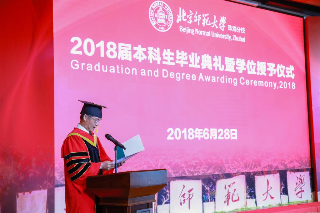校长涂清云以《凝聚新时代精神力量,做最好的自己》为题致辞。涂清云对2018届毕业生顺利完成学业表示热烈祝贺,他指出,人无精神不立,国无精神不强。在这个收获成长、启程远航的时刻,希望同学们不断凝聚起新时代的精神力量,努力做最好的自己。这种精神力量首先是习近平新时代中国特色社会主义思想,这种精神力量也包含珠海特区精神,这种精神力量还包含北师大校训精神和珠海分校大气的品质。他希望即将离开校园步入社会的毕业生们要志存高远、坚守责任,要脚踏实地、久久为功,要精益求精、追求卓越,要勤学善思、终身求索。