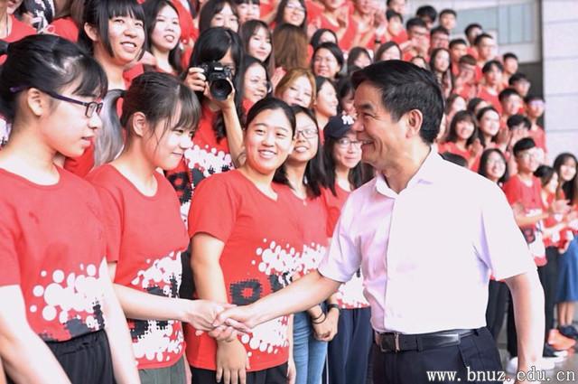 董奇对参加“母校情·北京行”活动的全体师生的到来表示热烈的欢迎,对北师大珠海校区建设的推进和珠海分校的转型升级做了介绍,对珠海分校今年招生再次取得进步深感欣喜。他表示,随着珠海校区建设的推进,珠海分校的同学们也将享受到更加优质的教育资源。同时希望此次北京行的同学们在这次交流学习活动中能用心观察,细细体会,并与身边的同学相互学习、共同分享,给自己两周的北京提升之行留下难忘的记忆。董奇还提醒同学们在北京考察学习期间要注意安全,并衷心祝愿各位同学生活愉快、学有所获。学生代表向董校长赠送了此次活动的纪念衫并合影留念。董校长走进同学们中间一一握手,同学们都被董校长热情所感染,一张张青春的面孔上都洋溢着灿烂的笑容。