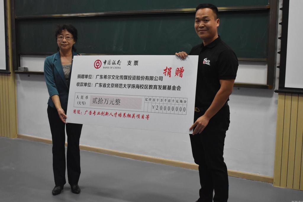 黄宇海在捐赠仪式上向虞立红转交了捐赠支票并在致辞中表示:“院校教育、企业培养、社会历练是人才培养三个密不可分环节。企业作为人才的使用者,同样对人才培养肩负着重要的责任和使命。希尔传媒非常愿意联合像珠海分校这样开展应用型人才培养的院校,共同探索广告创意人才的融合培育模式。在珠海分校设立“希尔创新人才基金”,就是希望通过产学研融合的方式来发现和激励更多的优秀广告创意人才,并为优秀的广告创意人才提供更多发展空间和机遇,同时诚挚欢迎珠海分校优秀广告创意人才毕业后到希尔文化传媒来工作创业。