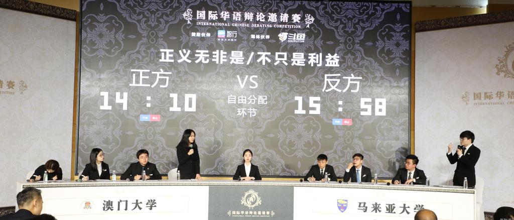 在小组赛中,24支辩论队分为八组,围绕“‘佛系’是/不是当代青年的幸福之道”、“诺贝尔文学奖有利于/不利于文学的发展”、“痛彻心扉的感情更应该淡忘/铭记”等辩题展开。经过激烈的比赛,澳门大学和马来亚大学会师决赛。双方围绕“正义无非是/不只是利益”这一辩题,展开了激烈的唇枪舌剑,最终,澳门大学凭借更为出色的发挥,赢得了本届比赛的冠军。