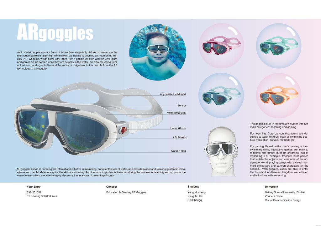 2018年iF设计新秀奖共设4个参赛主题,作品“AR goggles”以“解决青少年溺水问题”为主题进行设计,集教学和游戏于AR泳镜中,让泳镜使用者能够借此克服对水的恐惧,掌握正确的游泳和自救方法。同时,使用者还可通过AR泳镜感受丰富多彩的海洋世界,从而增加青少年、儿童对游泳的热爱。创作者之一史长琦说:“获奖作品是我们‘品牌语言’课程的结课作业。为了让作品更具现实意义,我们做了较为充分的调研。团队合作和坚持不懈,是我们认为能够获奖的重要原因。”