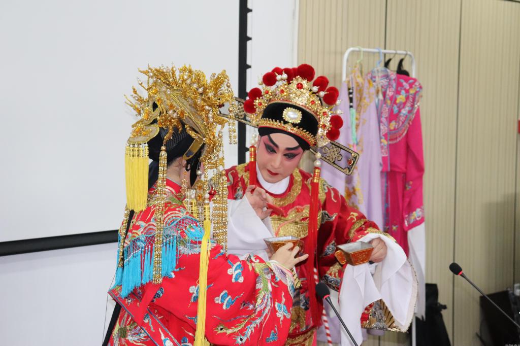 广东粤剧院的两位演员为现场师生生动演绎了粤剧中著名的折子戏《帝女花·香夭》,演员们婉转悠扬的唱腔、细致优雅的表演,让现场师生流连忘返,近距离地感受了粤剧悠久的文化魅力。