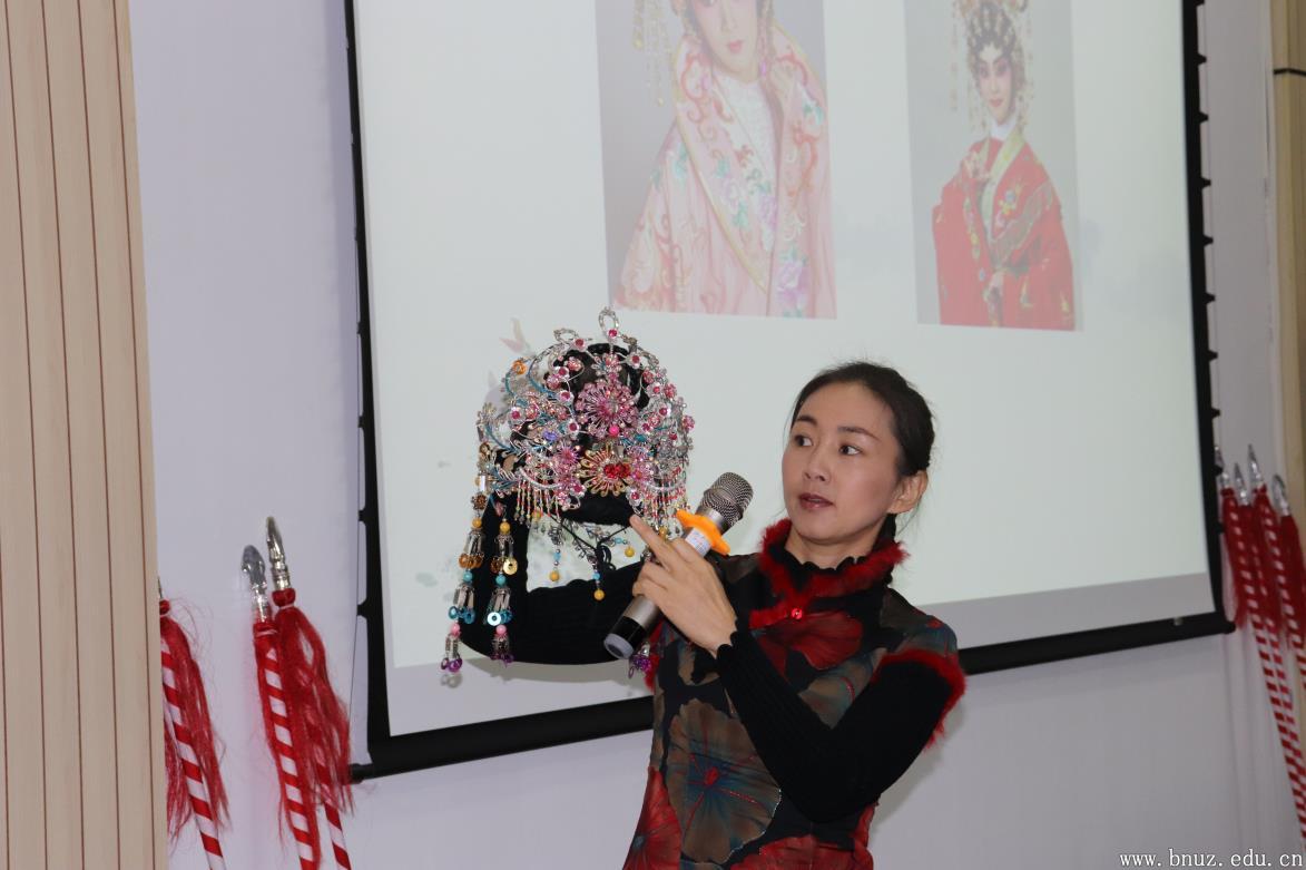 活动开始前,因逢国家公祭日,现场所有师生为南京大屠杀死难者默哀一分钟。广东粤剧院国家二级演员邱小娜老师结合粤剧唱腔选段,为现场同学开展了一场形式生动的粤剧主题讲座。邱老师从粤剧的起源和历史谈起,结合现场展示的头饰、服饰、道具等,为师生讲解了粤剧的脸谱、行当,讲解过程中穿插的粤剧唱段、身段表演,更是激起了现场师生的浓厚兴趣,赢得阵阵掌声。讲座过程中还邀请同学们上台,现场学习舞水袖、耍双头枪,当起了粤剧票友,使同学们在体验中进一步加深了对粤剧的了解。