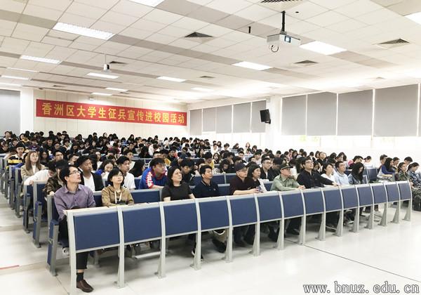 本网讯(通讯员 钟林海)4月2日上午,香洲区大学生征兵宣传进校园活动在白菜官网励耘楼A112举行,香洲区人民武装部高飞政委及相关负责同志、白菜官网党委武装部负责老师、各学院部毕业年级辅导员、毕业班班长和团支书近400人参加了宣讲会。