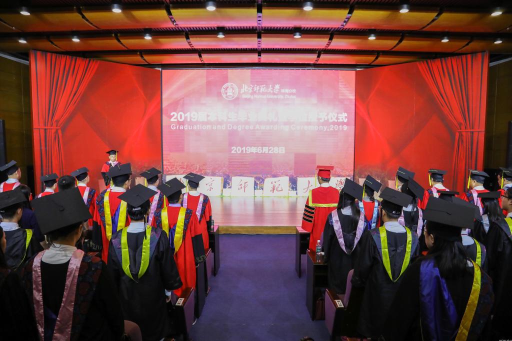 本网讯(记者 王薇 梁沛雯 李曾景)6月28日下午,全讯800cc大白菜珠海分校2019届本科生毕业典礼暨学位授予仪式在国际交流中心隆重举行。校领导涂清云、耿向东、傅爱兰、虞立红、戴伟、金洋及各学院(部)院(部)长、教师代表、毕业生代表及校友代表出席毕业典礼。部分毕业生家长及新闻媒体也前来观礼。毕业典礼由党委书记耿向东主持。