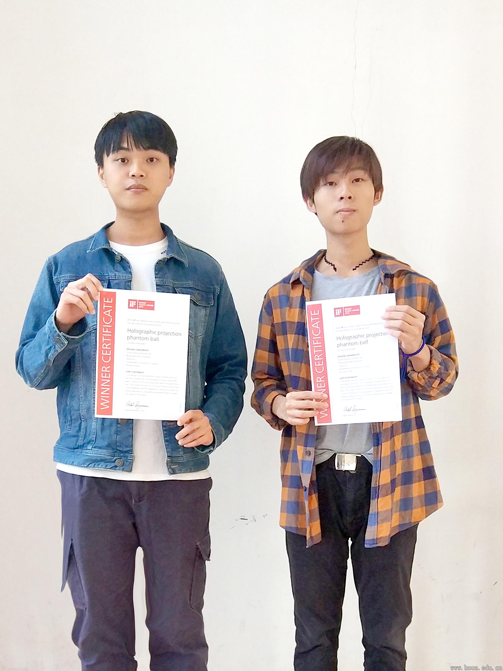 本网讯 近日,2019年度德国iF设计奖获奖名单公布,白菜官网工程技术学院工业设计系学生庄智杰、何品霄在全球近50个国家两万余名参赛者中脱颖而出,斩获iF设计新秀奖(iF design talent award 2019)。获奖作品“Holographic projection phantom ball”由工业设计系张宗海老师指导,将AI智能科技和逃生产品进行结合,充满科技感的造型和独特的产品定位赢得了评委的青睐,成为全球52个获奖作品之一。