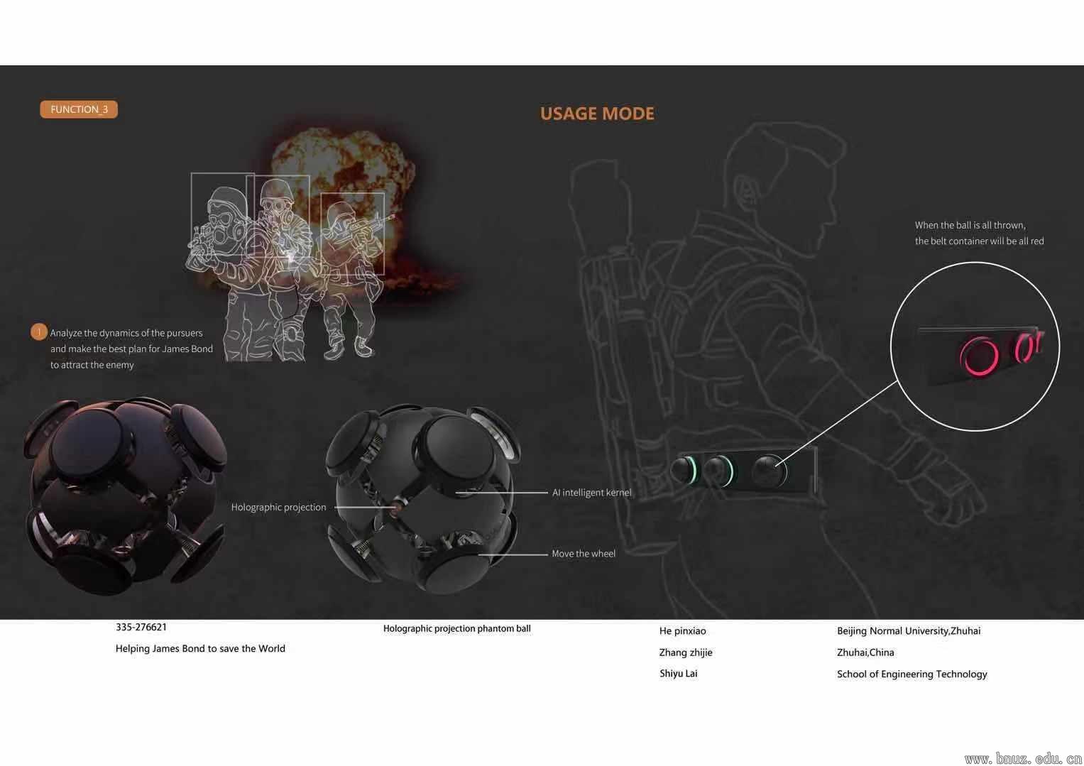 作品“Holographic project phantom ball”是一款全息投影移动球产品。它具有三个功能特点:一、全息投影功能,复制另外一个詹姆斯邦德或者其他动物以吸引敌人注意力;二、移动功能,行动中的单位往往更能够吸引视线;三、AI智能科技,判断弹道进行躲闪以及更加真实的模拟被投影物体的行为,增强可信度。使用者只需从腰间取出投影球,将其投向敌人,球就会自动弹开并开启全息投影,同时通过AI智能科技的计算结果运用移动、发声、变换投影等方式来吸引敌人注意力,以达到逃离的目的。