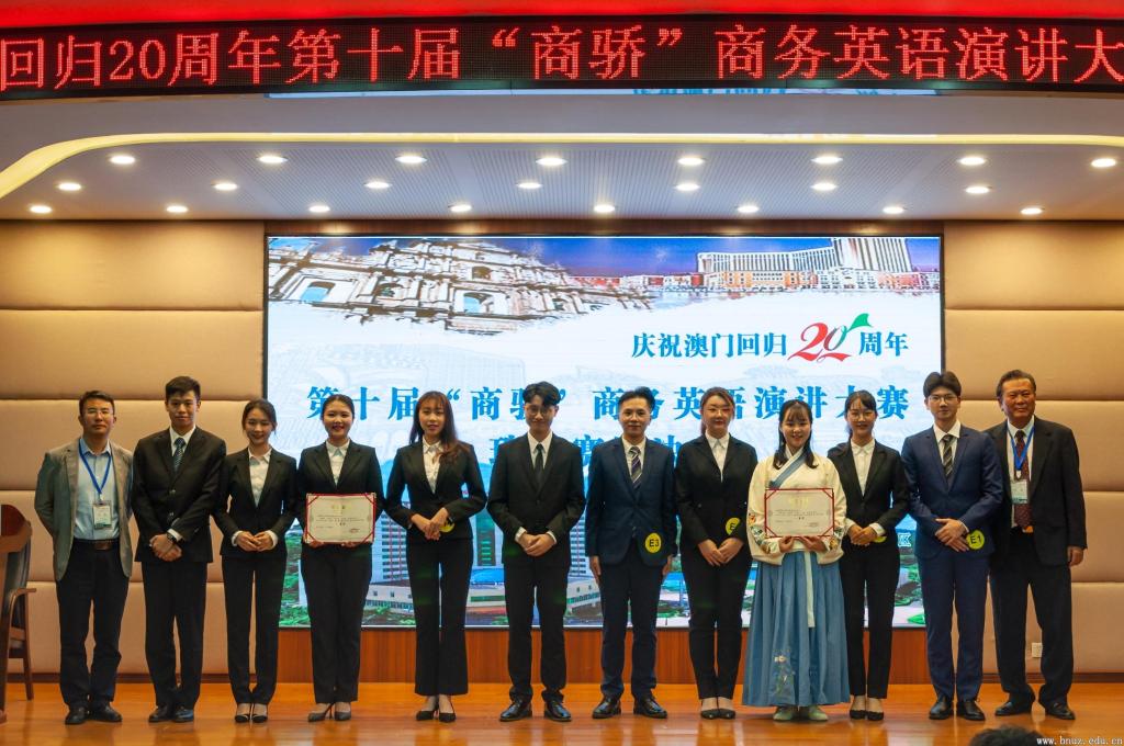 本网讯(通讯员 罗敏)为庆祝澳门回归20周年,2019年12月28日,澳门第十届“商骄”商务英语演讲大赛珠海赛区决赛在遵义医科大学珠海校区举行。经过激烈角逐,由来自外国语学院的娜仁易华、李泽林、朱蕊,国际商学部的田知欣以及物流学院的李浩轩五位同学组成的全讯800cc大白菜珠海分校代表队勇夺决赛一等奖,将代表珠海赛区参加在澳门举办的总决赛。