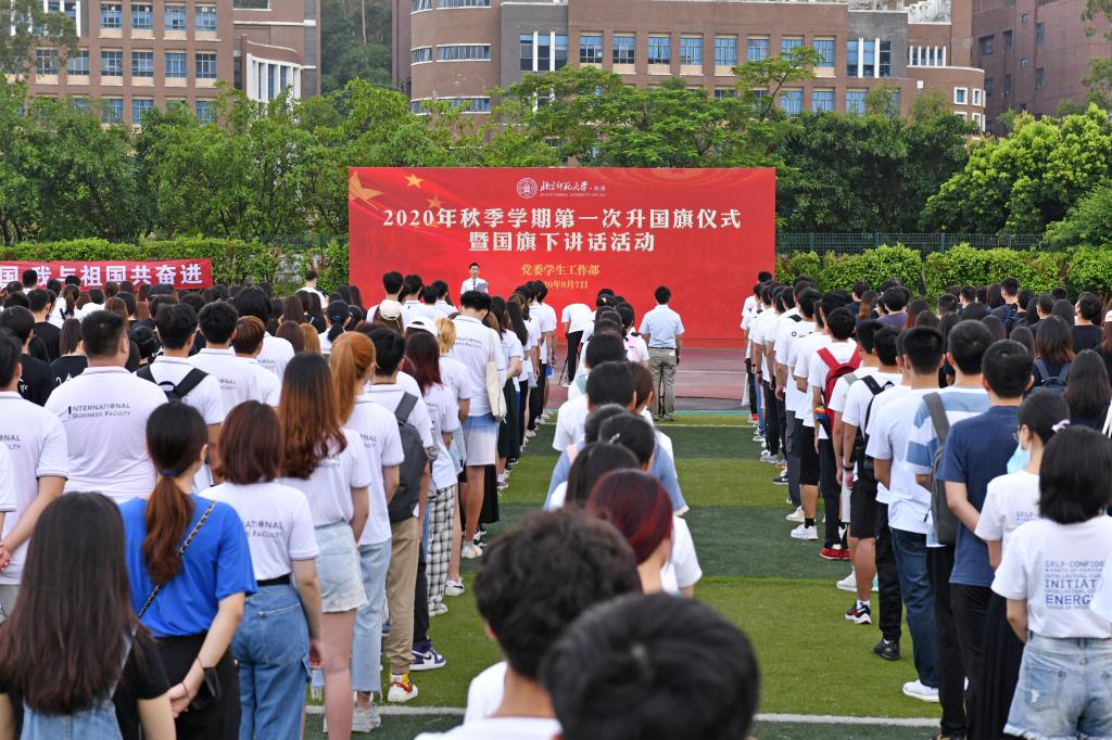 本网讯(通讯员 朱珊珊)9月7日,为上好开学第一课,加强大学生的爱国主义教育和社会主义核心价值观教育,学校举行2020-2021 学年秋季学期第一次升国旗仪式暨国旗下讲话活动。珠海校区党委副书记兼珠海分校党委副书记亓振华出席仪式并讲话,各学院部党总支、直属党支部副书记,教师代表与学生代表一千余人参加了活动。升旗仪式由党委学生工作部部长李楠主持。